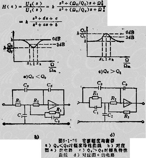 當歐X=歐O=歐M時,此傳遞函數(shù)對應有源幅度均衡器的幅度特性和電路結構如圖5.1-25所示。顯然,給定不同的歐X、歐W、歐O、歐O和K值就可得出各種步同增益頻率特性曲線,利用這些曲線相加,則可獲得所需要的均衡幅度特性曲線。