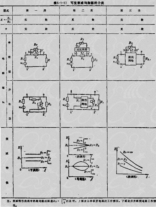 從表中可以看出,可變衰減均衡器屬于六端網(wǎng)絡結構:1-1'端和2-2'端為正常傳輸信號用的輸入端和輸出端;3-3'端接熱敏電阻RT或接包含有熱敏電阻RT的阻抗網(wǎng)絡。根據(jù)電路結構不同,共分三類,第一、二類可變衰減均衡器又有串聯(lián)和并聯(lián)型兩種形式。