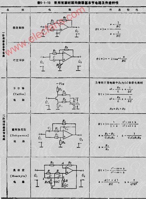 時延均衡器的幅度特性在全頻域內(nèi)為一常數(shù),僅其相移特性與頻率有關。而時延均衡器電路和實現(xiàn)可由無源L、C、R構成,也可由R、C網(wǎng)絡及有源器件來構成,后者稱之為有源時延均衡器,其種類很多,常用的有由一階和二階形式的基本節(jié)鏈接而成的電路,其相移及時延由所有基本節(jié)的總和來確定。表5.1-19示出幾種常用有源時延均衡器基本節(jié)電路及傳遞特性。