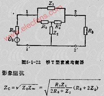 1)對稱橋T型固定衰減均衡器的基本結構及特性? 對稱橋T固定衰減均衡器為對稱橋T型四端網(wǎng)絡,基本結構示于圖5.1-22。