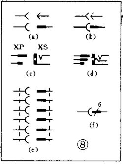 接插件的圖形符號(hào)見(jiàn)圖 8 。其中( a )表示一個(gè)插頭和一個(gè)插座,(有兩種表示方式)左邊表示插座,右邊表示插頭。( b )表示一個(gè)已經(jīng)插入插座的插頭。( c )表示一個(gè) 2 極插頭座,也稱(chēng)為 2 芯插頭座。( d )表示一個(gè) 3 極插頭座,也就是常用的 3 芯立體聲耳機(jī)插頭座。( e )表示一個(gè) 6 極插頭座。為了簡(jiǎn)化也可以用圖( f )表示,在符號(hào)上方標(biāo)上數(shù)字 6 ,表示是 6 極。接插件的文字符號(hào)是 X 。為了區(qū)分,可以用“ XP ”表示插頭,用“ XS ”表示插座。