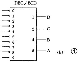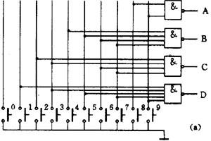 圖 4 ( a )是一個能把十進制數(shù)變成二進制碼的編碼器。一個十進制數(shù)被表示成二進制碼必須 4 位,常用的碼是使從低到高的每一位二進制碼相當于