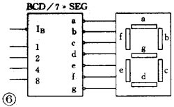 二極管,如每段都接低電平 0 ,七段都被點亮,顯示出數(shù)字“ 8 ”;如 b 、 c 段接低電平 0 ,其余都接 1 ,顯示的是“ 1 ”??梢娨咽M制數(shù)用七段顯示管顯示出來還要經(jīng)過一次譯碼。如果使用“ 4 線 —7 線譯碼器”和顯示管配合使用,就很簡單,輸入二進制碼可直接顯示十進制數(shù),見圖 6 。譯碼器左側有 4 個二進制碼的輸入端,右側有 7 個輸出可直接和數(shù)碼管相連。左上側另有一個滅燈控制端 I B ,正常工作時應加高電平 1 ,如不需要這位數(shù)字顯示就在 I B 上加低電平 0 ,就可使這位數(shù)字熄滅。