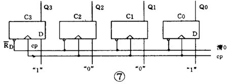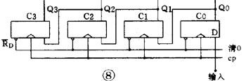 圖 8 是一個能把數(shù)碼逐位左移的寄存器。它和一般寄存器不同的是:數(shù)碼是逐位串行輸入并加在最低位的 D 端,然后把低位的 Q 端連到高一位的 D 端。這時 CP 稱為移位脈沖。