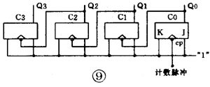 現(xiàn)舉一個最簡單的加法計數(shù)器為例,見圖 9 。它是一個 16 進制計數(shù)器,最大計數(shù)值是 1111 ,相當于十進制數(shù) 15 。需要計數(shù)的脈沖加到最低位觸發(fā)器的 CP 端上,所有的 J 、 K 端都接高電平 1 ,各觸發(fā)器 Q 端接到相鄰高一位觸發(fā)器的 CP 端上。 J—K 觸發(fā)器的特性表告訴我們:當 J=1 、 K=1 時來一個 CP ,觸發(fā)器便翻轉一次。在全部清零后, ① 第 1 個 CP 后沿,觸發(fā)器 C0 翻轉成 Q0=1 ,其余 3 個觸發(fā)器仍保持 0 態(tài),整個計數(shù)器的狀態(tài)是 0001 。 ② 第 2 個 CP 后沿,觸發(fā)器 C0 又翻轉成“ Q0=0 , C1 翻轉成 Q1=1 ,計數(shù)器成 0010 。 …… 到第 15 個 CP 后沿,計數(shù)器成 1111 ??梢娺@個計數(shù)器確實能對 CP 脈沖計數(shù)。