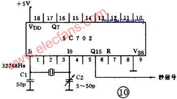 生 32768 赫標準信號脈沖,經(jīng)過 15 級 2 分頻處理得到 1 赫的秒信號。因為晶體振蕩器的準確度和穩(wěn)定度很高,所以得到的秒脈沖信號也是精確可靠的。把它們做到一個集成片上便是電子手表專用集成電路產(chǎn)品,見圖 10 。