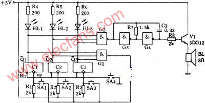 競賽開始,假定 1 號臺搶先按下 SA1 ,觸發(fā)器 C1 翻轉成 Q1=1 、 Q1=0 。于是: ① 門 2 輸出為 1 ,振蕩器振蕩,揚聲器發(fā)聲; ②HL1 燈點亮; ③ 門 1 輸出為 1 ,這時 2 號、 3 號臺再按開關也不起作用。裁判宣布競賽結果后,再按一下 SA4 ,電路又進入準備狀態(tài)。
