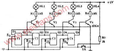 圖 12 是 4 位移位寄存器控制的彩燈電路。開始時按下 SA ,觸發(fā)器 C1 ~ C4 被置成 1000 ,彩燈 HL1 被點亮。 CP 脈沖來到后,寄存器移 1 位,觸發(fā)器 C1 ~ C4 成 0100 ,彩燈 HL2 點亮。第 2 個 CP 脈沖點亮 HL3 ,第 3 個點亮 HL4 ,第 4 個 CP 又把觸發(fā)器 C1 ~ C4 置成 1000 ,又點亮 HL1 。如此循環(huán)往復,彩燈不停閃爍。只要增加觸發(fā)器可使燈數(shù)增加,改變 CP 的頻率可變化速度。
