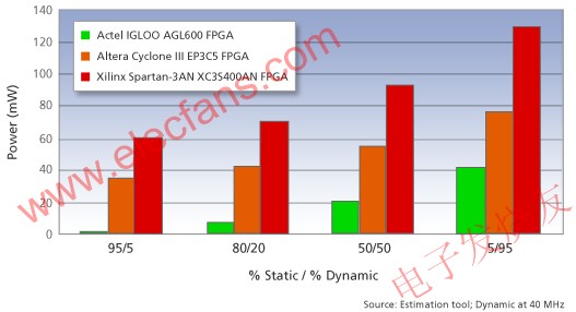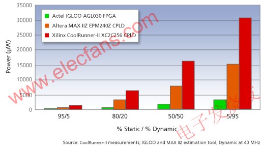 在所有這些功耗方式下,Actel IGLOO系列 FPGA的功耗都顯著減小,因而能優(yōu)化系統(tǒng)中可編程邏輯部分的功耗。