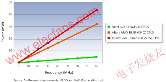 與邏輯密度相同并采用1.8V內核電壓的競爭對手的CPLD器件不同,IGLOO 系列FPGA采用1.2 V內核電壓,因而大大降低了動態(tài)功耗。下圖為采用相同設計的一些低密度PLD的功耗 (mW) 頻率曲線。