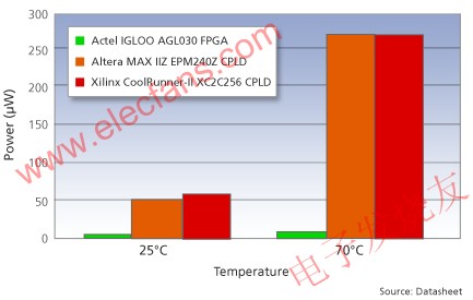 Actel的 IGLOO系列 FPGA在高溫下具有更大的功耗優(yōu)勢。下圖為競爭CPLD和IGLOO系列FPGA在25°C 和70°C工作時的靜態(tài)功耗比較。根據(jù)數(shù)據(jù)手冊的數(shù)據(jù)統(tǒng)計,從中看出,在25°C時,IGLOO系列 FPGA的靜態(tài)功耗降低至十分之一,在70°C時,更低至三十分之一,因而是那些在典型溫度和高溫下工作的功耗敏感應用的最佳解決方案。