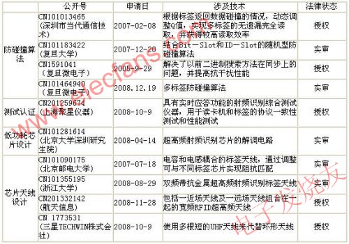 超高頻RFID的核心技術(shù)主要包括:防碰撞算法、低功耗芯片設(shè)計、UHF電子標簽天線設(shè)計、測試認證等方面。國內(nèi)在超高頻自動識別技術(shù)研發(fā)上滯后國際2-3年,雖形成一批專利技術(shù),但數(shù)量較少。以下簡要介紹這些技術(shù)在中國申請,并已經(jīng)公開或授權(quán)的相關(guān)專利。