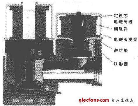開關(guān)閥是一個(gè)通斷型電磁閥,根據(jù)控制器的電信號(hào)來打開或關(guān)閉閥口,如中圖所示。