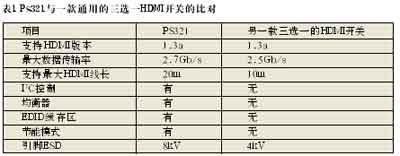 PS321作為一款三選一的HDMI開關(guān),與其他廠商相類似的產(chǎn)品相比較具有較多優(yōu)勢(shì)。將PS321與另一款通用的三選一HDMI開關(guān)進(jìn)行比對(duì),結(jié)果如表1所示。