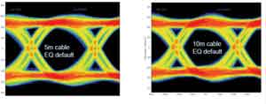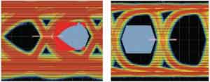 進(jìn)行如下測(cè)試:準(zhǔn)備兩根HDMI線,一根長(zhǎng)5m,一根長(zhǎng)10m,在均衡器增益均為默認(rèn)值下同樣傳輸2.25Gb/s數(shù)據(jù)率的信號(hào),得到如圖2所示的數(shù)據(jù)眼圖。經(jīng)比對(duì),10m長(zhǎng)的傳輸眼圖的面積比5m的小,但還不影響傳輸信號(hào)的完整性。設(shè)計(jì)者在使用均衡器設(shè)計(jì)時(shí),需要判斷信號(hào)的強(qiáng)弱以決定采用哪一擋的增益。目前在電視設(shè)計(jì)中經(jīng)常遇到需要一個(gè)側(cè)置的HDMI接口,而HDMI開關(guān)通常在主板上,離側(cè)置的HDMI接口有一段距離。當(dāng)然此距離一般不會(huì)超過1m,采用標(biāo)準(zhǔn)的HDMI線不會(huì)影響到信號(hào)質(zhì)量,但是如果采用普通的連接線就可能造成信號(hào)失真。此時(shí)需要通過適當(dāng)提高均衡器的增益大小,以保證信號(hào)傳輸?shù)耐暾浴H鐖D3所示。左側(cè)為PS321輸入端采集的普通連接線的傳輸信號(hào),可以看到眼圖面積變小,信號(hào)的損失很大;右側(cè)為經(jīng)過PS321提高均衡器的增益后采集的傳輸信號(hào),可以看到信號(hào)經(jīng)整形后恢復(fù)完整性。
