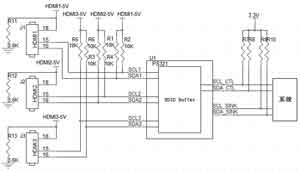 DDC(顯示數(shù)據(jù)通道)主要用于HDMI源端設(shè)備(Source)與接收端設(shè)備(Sink)之間進(jìn)行EDID數(shù)據(jù)及HDCP密鑰的交流。通過EDID交流,源端設(shè)備可以了解到接收端設(shè)備音視頻的接收能力;通過HDCP Key的交流,可以實(shí)時(shí)的進(jìn)行數(shù)據(jù)流的內(nèi)容保護(hù)認(rèn)證,從而達(dá)到數(shù)據(jù)內(nèi)容保護(hù)的目的。DDC的電路方式與I2C電路相同,因此在DDC電路設(shè)計(jì)中,設(shè)計(jì)者要考慮到DDC線路的電平。按照HDMI 1.3a規(guī)范,HDMI源端DDC的上拉電阻最小為1.5kΩ,考慮到HDMI認(rèn)證中DDC電平的要求(在 4.5~5.5V之間),將DDC信號(hào)均通過10kΩ的電阻上拉到HDMI接口的第18引腳(HDMI源端5V電源),如圖1所示。經(jīng)計(jì)算,源端與接收端的DDC總上拉電阻的最小值為R總上拉min =1.5kΩ‖10kΩ=1.3kΩ。經(jīng)測(cè)試,接收端DDC的電平約為4.68V,因此滿足HDMI認(rèn)證要求;而DDC總上拉電阻的最小值 1.3kΩ也滿足I2C的規(guī)范。