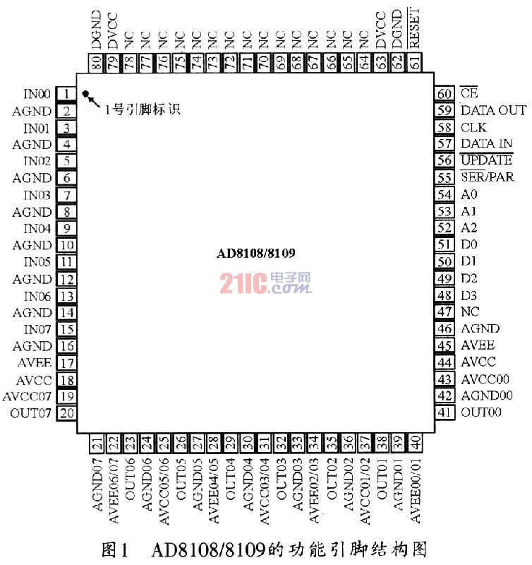 ??? AD8108/AD8109采用TQFP封裝,共有80引腳,其引腳結(jié)構(gòu)如圖1所示。各主要引腳的功能如下: