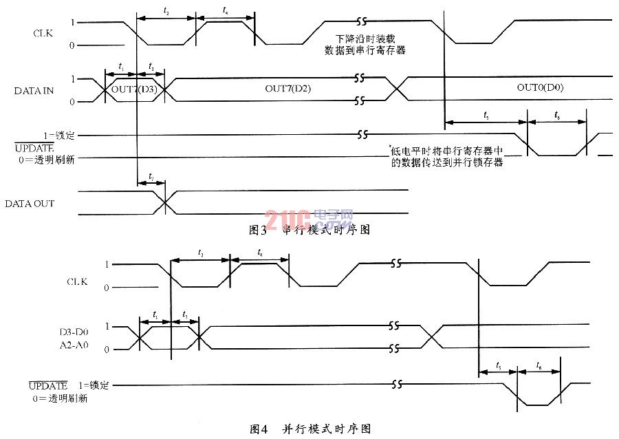 ??? 圖4所示是其工作在并行模式時的時序圖。該模式下,數(shù)據(jù)的建立時間和信號的鎖存時間均與串行模式相同。