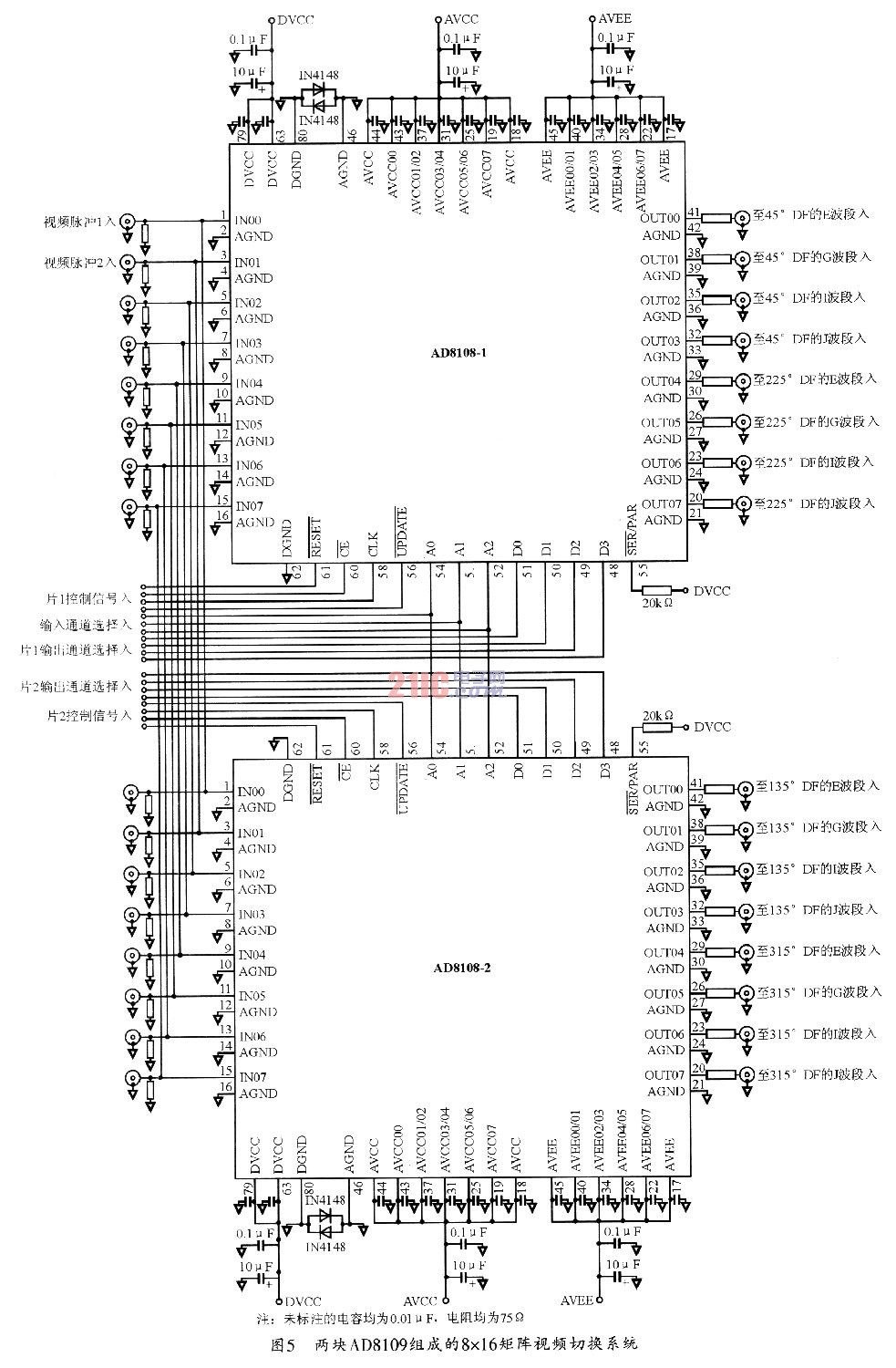 時,可將它們與AD8116配合使用。圖5所示是使用2片AD8108組成的8x16視頻切換系統(tǒng),該系統(tǒng)可實現(xiàn)8路輸入中的任一路向16路輸出中的任一