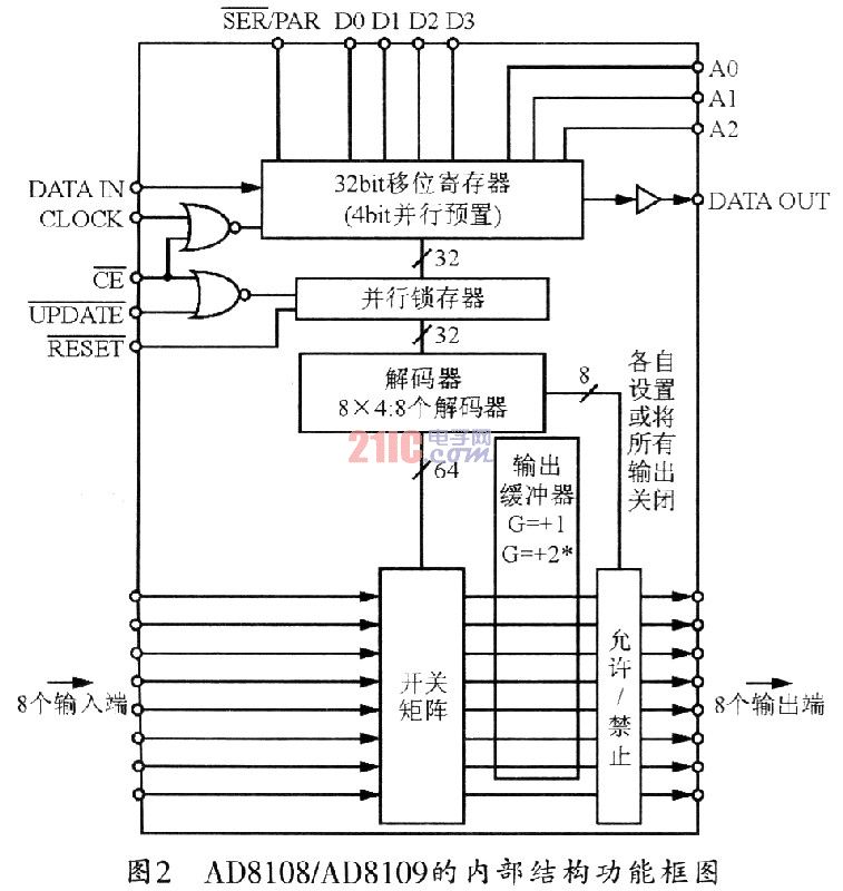 ??? AD8108(G=1)和AD8109(G=2)具有相同的內(nèi)核。其容量都是8×8。主要由32 bit移位寄存器、并行鎖存器、解碼器、64點的切換矩陣和輸