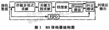 由于RS碼為分組碼,故其譯碼算法主要由伴隨式計算、關鍵方程求解和錢搜索和Forney算法3部分構成,譯碼器結構如圖1所示。