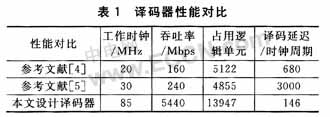 譯碼器在Quartus II 8.0上進行綜合和優(yōu)化,采用Altera公司Cyclone系列的EP2C15AF256C8芯片為目標器件。譯碼器的工作時鐘頻率可達85 MHz,數(shù)據(jù)吞吐率可達5 440 Mb/s,占用邏輯單元數(shù)為13 947個(片內(nèi)共14 448,占用率為97%),RAM占用16 698位(片內(nèi)共239 616位,占用率為7%)。譯碼器性能對比如表1所列。