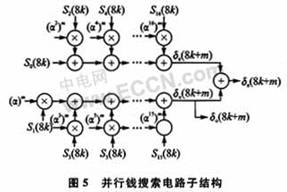 并行錢搜索電路子結構如圖5所示。圖中m表示并行模塊編號數(shù),m=1,2,…,8。所有的乘法器均是常數(shù)乘法器,8倍并行結構由圖5所示的8個同樣的結構組成。