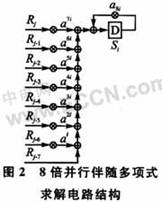 本設計采用8倍并行流水方案。將255個碼元8倍并行后,只需要32個周期便完成所有32個伴隨多項式系數(shù)的求解。然后將32個伴隨多項式系數(shù)順序輸出到下一級,在此基礎上采用流水線結構,周期剛好滿足且不會浪費資源。本設計中所有乘法器都是采用GF(28)有限域乘法器。