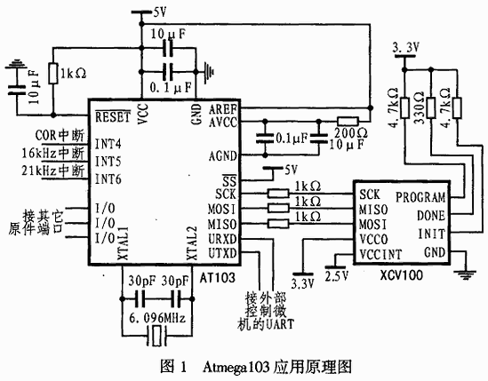 根據(jù)電臺FH信號處理模塊對單片機的要求,如果選用89C5X系列單片機,不但在實現(xiàn)功能上比較困難(如運算速度、I/O口數(shù)量等),而且所需的外圍擴展電路也必須增加(如RAM,通信口等)。而選用ATmega103單片機則能較好地滿足設(shè)計要求,因此,本設(shè)計選用ATmega103單片機來實現(xiàn)信號處理模塊的功能。圖1所示是其硬件原理圖。