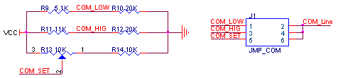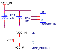 為外部電源接口,最高電壓不要超過(guò)12V,J2為電源選擇跳線(xiàn),VCC_5即為由61板通過(guò)10PIN排線(xiàn)引入模組的電源;VCC即為模組的放大器、調(diào)理電路的供電電源。當(dāng)用戶(hù)使用61板為其供電時(shí),要把VCC與VCC_5V短接;而使用外部電源時(shí),要把VCC與VCC_IN短接。
