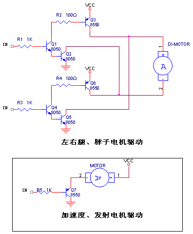 機(jī)器人驅(qū)動(dòng)電路采用功率較大的三極管搭成H橋來(lái)驅(qū)動(dòng)電機(jī),可以實(shí)現(xiàn)電機(jī)的正向旋轉(zhuǎn)與電機(jī)的反向旋轉(zhuǎn)。這些電機(jī)包括2個(gè)用于走路的電機(jī)與一個(gè)頭部轉(zhuǎn)向的電機(jī)。另外用了一個(gè)三極管驅(qū)動(dòng)單向旋轉(zhuǎn)的電機(jī),包括加速電機(jī)與發(fā)射電機(jī),驅(qū)動(dòng)電路比較簡(jiǎn)單。