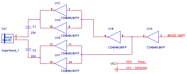 由單片機(jī)產(chǎn)生40KHz的方波,并通過(guò)模組接口(J4)送到模組的CD4049,而后面的CD4049則對(duì)40KHz頻率信號(hào)進(jìn)行調(diào)理,以使超聲波傳感器產(chǎn)生諧振。