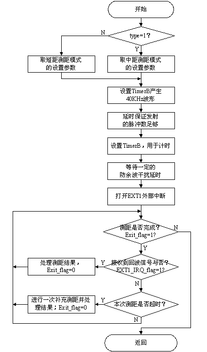 在播放背景音樂(lè)的同時(shí),程序?qū)⒄{(diào)用超聲波測(cè)距函數(shù)進(jìn)行機(jī)器人前方障礙物檢測(cè)。測(cè)距函數(shù)利用TimerB產(chǎn)生40KHz的PWM方波驅(qū)動(dòng)超聲波發(fā)射傳感器。當(dāng)接收傳感器接收到回波后經(jīng)過(guò)處理電路處理將引起SPCE061A的外部中斷,計(jì)算從發(fā)射超聲波到產(chǎn)生中斷的時(shí)間,即可計(jì)算出目標(biāo)物體的距離。測(cè)距函數(shù)流程如圖4-4所示。