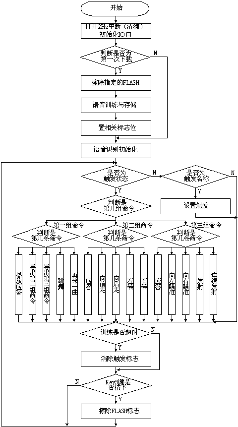 按順序訓(xùn)練以下15條指令:"名稱(chēng)","開(kāi)始","準(zhǔn)備","跳舞","再來(lái)一曲","開(kāi)始","向前走","倒退","右轉(zhuǎn)","左轉(zhuǎn)","準(zhǔn)備","向左瞄準(zhǔn)","向右瞄準(zhǔn)","發(fā)射","連續(xù)發(fā)射"。每條指令要訓(xùn)練兩遍。當(dāng)一條指令被正確識(shí)別時(shí)會(huì)提示進(jìn)入下一條;如沒(méi)有被識(shí)別會(huì)要求重復(fù)該指令,直到正確識(shí)別為止。