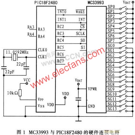 美國(guó)MOTOROLA公司推出的可編程多路開(kāi)關(guān)檢測(cè)接口集成電路MC33993可檢測(cè)多達(dá)22路的開(kāi)關(guān)量輸入信號(hào),并可將檢測(cè)到的多路開(kāi)關(guān)狀態(tài)(三態(tài))信號(hào)通過(guò)該芯片的SPI(串行外圍接口)傳送給MCU(微控制