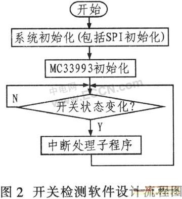 美國(guó)MOTOROLA公司推出的可編程多路開(kāi)關(guān)檢測(cè)接口集成電路MC33993可檢測(cè)多達(dá)22路的開(kāi)關(guān)量輸入信號(hào),并可將檢測(cè)到的多路開(kāi)關(guān)狀態(tài)(三態(tài))信號(hào)通過(guò)該芯片的SPI(串行外圍接口)傳送給MCU
