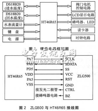 ??????? 硬件部分主要由HT46R65、電源模塊、時(shí)鐘電路、溫度傳感器DSl8820、水表流量計(jì)、鍵盤(pán)和液晶LCD顯示電路、讀卡器、閥門(mén)電機(jī)控制電路等部分組成。外圍組件與MCU的相互關(guān)系如圖1所示,其中ZLG500與HT46R65的接線如圖2所示。