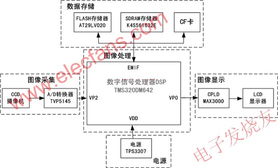 2 本文提出了一種實時圖像采集和處理系統(tǒng)的設計方法,該系統(tǒng)以TMS320DM642[1-2]為核心,結合視頻解碼芯片SAA7115H和OSD FPGA構成實時圖像采集和處理系統(tǒng)電路。 1 系統(tǒng)總體設計