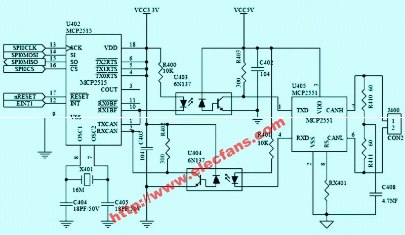 硬件電路的設(shè)計(jì)主要是CAN通信控制器與微處理器之間和CAN總線收發(fā)器與物理總線之間的接口電路的設(shè)計(jì)。CAN通信控制器是CAN總線接口電路的核心,主要完成CAN的通信協(xié)議,而CAN總線收發(fā)器的主要功能是增大通信距離,提高系統(tǒng)的瞬間抗干擾能力,保護(hù)總線,降低射頻干擾(RFI),實(shí)現(xiàn)熱防護(hù)等。