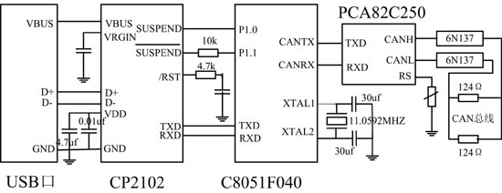 系統(tǒng)主要包含三部分:微控制器、USB接口和CAN接口的控制部分(見圖1)。其中C8051F040作為系統(tǒng)微控制器。USB接口功能控制器采用CP2102 USB轉UART橋接芯片。其中C8051F040作為CAN總線控制器負責與CAN網(wǎng)絡交換數(shù)據(jù),CP2102實現(xiàn)USB口信息格式與串口格式的轉換,最后由C8051F040操作串口與CP2102交換數(shù)據(jù),實現(xiàn)USB2.0到CAN總線協(xié)議的轉換。
