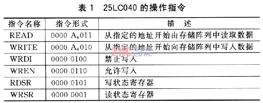 ??? 25LC040是SPI接口的4 Kb EEPROM,至少可以擦寫(xiě)1 000萬(wàn)次,數(shù)據(jù)至少可以保存200年,可以滿足大部分?jǐn)?shù)據(jù)存儲(chǔ)的要求。DSP必須能通過(guò)相應(yīng)的指令實(shí)現(xiàn)對(duì)25LC040的訪問(wèn)。25LC040的操作指令如表1所列。