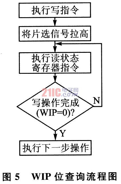 ??? 25LC040要求在寫(xiě)操作之后有一定的寫(xiě)周期時(shí)間來(lái)存儲(chǔ)數(shù)據(jù),其間TMS320F2812對(duì)25LC040的所有訪問(wèn)會(huì)被忽略。每個(gè)器件都有規(guī)定的最壞情況寫(xiě)周期時(shí)間,可以通過(guò)在再次訪問(wèn)25LC040之前插入不小于最壞情況寫(xiě)周期時(shí)間的延時(shí)等待來(lái)確保遵守寫(xiě)周期時(shí)間。但是25LC040常常會(huì)在最大規(guī)定時(shí)間內(nèi)完成寫(xiě)周期,而此時(shí)TMS320F2812還在等待,會(huì)造成不必要的時(shí)間浪費(fèi)。25LC040內(nèi)部有一個(gè)狀態(tài)寄存器,其第l位為WIP(Write-In-Process)位,該位是一個(gè)只讀位,可以顯示25LC040是否處在寫(xiě)周期內(nèi)。當(dāng)芯片處于寫(xiě)周期時(shí),WIP位置1;當(dāng)寫(xiě)操作完成時(shí),WIP位立即清零。狀態(tài)寄存器在寫(xiě)操作期間仍然可讀,可以通過(guò)讀狀態(tài)寄存器指令(WRSR)來(lái)獲取狀態(tài)寄存器的內(nèi)容,從而得到WIP位的值以判斷寫(xiě)周期何時(shí)完成,以進(jìn)入下一步操作。這樣就可以減少不必要的等待時(shí)間,使運(yùn)行更加高效。具體的流程如圖5所示。