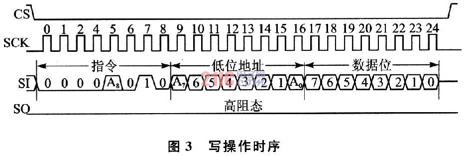 ??? 寫(xiě)使能操作完成后,片選信號(hào)應(yīng)該被拉低以進(jìn)行寫(xiě)操作,時(shí)序如圖3所示。寫(xiě)指令、寫(xiě)入地址以及寫(xiě)入的數(shù)據(jù)會(huì)被依次傳送到25LC040中。若要使數(shù)據(jù)正確地寫(xiě)入到存儲(chǔ)陣列中,片選信號(hào)應(yīng)該在最后一個(gè)有效字節(jié)的D0位傳送完畢后被拉高。