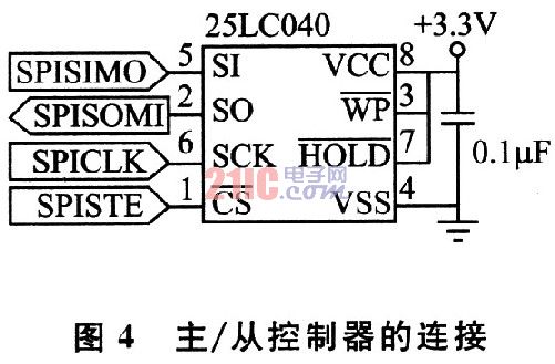 ??? 通信中將SPISIMO、SPISOMI和SPICLK設(shè)置為基本功能SPI口,SPISTE設(shè)置為一般I/O口。作為25LC040的片選信號(hào),當(dāng)主/從控制器進(jìn)行數(shù)據(jù)交換時(shí),SPISTE配置成低電平,數(shù)據(jù)傳輸結(jié)束后再配置成高電平。