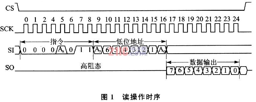 ??? 當(dāng)片選信號(hào)為低時(shí),向25LC040傳送8位的讀指令(0000 A8011),緊接著傳送需要讀取數(shù)據(jù)的低8位地址。當(dāng)正確的讀寫(xiě)指令和地址被識(shí)別后,EEPROM中對(duì)應(yīng)地址的數(shù)據(jù)將會(huì)由輸出引腳順次傳出,若繼續(xù)提供時(shí)鐘信號(hào),下一位地址對(duì)應(yīng)的數(shù)據(jù)也會(huì)依次讀出。當(dāng)片選信號(hào)為高時(shí),讀數(shù)據(jù)的操作將會(huì)被終止。其具體操作如圖1所示。圖中,CS為片選信號(hào),SCK為時(shí)鐘信號(hào),SI為輸入引腳信號(hào),SO為輸出引腳信號(hào)。