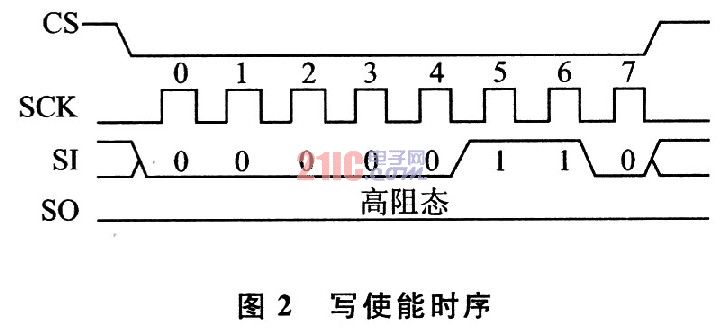 ??? 在對(duì)25LC040進(jìn)行任何寫(xiě)操作之前,必須先執(zhí)行WREN(寫(xiě)使能)指令。寫(xiě)使能指令的操作如圖2所示。先使片選信號(hào)為低,然后傳送寫(xiě)使能指令到25LC040中,指令傳送完畢后,必須將片選信號(hào)設(shè)置為高以完成寫(xiě)使能操作。如果寫(xiě)指令傳送結(jié)束后沒(méi)有拉高片選信號(hào),直接進(jìn)行寫(xiě)操作,那么數(shù)據(jù)將不會(huì)寫(xiě)入到存儲(chǔ)陣列中。