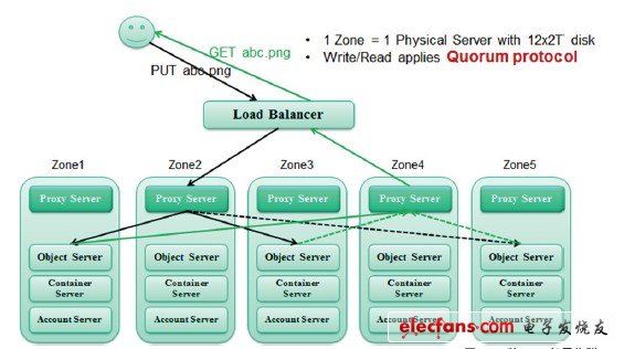 圖4中是新浪SAE在測試環(huán)境中部署的Swift集群,集群中又分為5個Zone,每個Zone是一臺存儲服務(wù)器,每臺服務(wù)器上由12塊2TB的SATA磁盤組成,只有操作系統(tǒng)安裝盤需要RAID,其他盤作為存儲節(jié)點,不需要RAID。前面提到過,Swift采用完全對稱的系統(tǒng)架構(gòu),在這個部署案例中得到了很好的體現(xiàn)。圖4中每個存儲服務(wù)器的角色是完全對等的,系統(tǒng)配置完全一樣,均安裝了所有Swift服務(wù)軟件包,如Proxy Server、Container Server和Account Server等。上面的負載均衡(Load Balancer)并不屬于Swift的軟件包,出于安全和性能的考慮,一般會在業(yè)務(wù)之前擋一層負載均衡設(shè)備。當(dāng)然可以去掉這層代理,讓Proxy Server直接接收用戶的請求,但這可能不太適合在生產(chǎn)環(huán)境中使用。 圖4中分別表示了上傳文件PUT和下載文件GET請求的數(shù)據(jù)流,兩個請求操作的是同一個對象。上傳文件時,PUT請求通過負載均衡隨機挑選一臺Proxy Server,將請求轉(zhuǎn)發(fā)到后者,后者通過查詢本地的Ring文件,選擇3個不同Zone中的后端來存儲這個文件,然后同時將該文件向這三個存儲節(jié)點發(fā)送文件。這個過程需要滿足NWR策略(Quorum Protocol),即3份存儲,寫成功的份數(shù)必須大于3/2,即必須保證至少2份數(shù)據(jù)寫成功,再給用戶返回文件寫成功的消息。下載文件時,GET請求也通過負載均衡隨機挑選一臺Proxy Server,后者上的Ring文件能查詢到這個文件存儲在哪三個節(jié)點中,然后同時去向后端查詢,至少有2個存儲節(jié)點“表示”可以提供該文件,然后Proxy Server從中選擇一個節(jié)點下載文件。