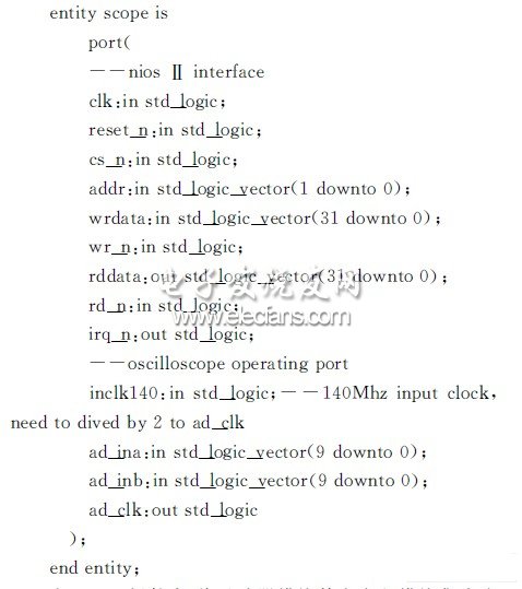 進行基于Nios Ⅱ 的SOPC 系統(tǒng)開發(fā)時,可利用ALTERA提供的SOPC插件,進行外設和CPU的配置,并提供自定義IP的構建方法。在虛擬示波器系統(tǒng)中,需要開發(fā)符合AVALON總線的示波器模塊,并加入到自定義IP中。示波器模塊實體程序如下: