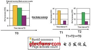 為了說(shuō)明這一點(diǎn),考慮這樣一個(gè)情況,總線在時(shí)間區(qū)間T的活動(dòng)表明,對(duì)所有組的訪問(wèn)是均衡的,但離頁(yè)訪問(wèn)比例較高,但在較小時(shí)間區(qū)間(T1、T2,其中T1+T2=T)中記錄的總線活動(dòng)表明對(duì)各組的訪問(wèn)是不均衡的,見(jiàn)圖2。如果緩存布局可對(duì)時(shí)間區(qū)間T1和T2分別進(jìn)行優(yōu)化,則有可能顯著改善系統(tǒng)性能。