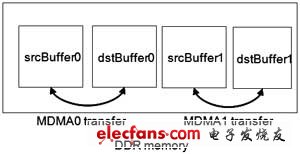 Now consider an example program where multiple buffers are mapped in the DDR memory and memory DMA's are used to transfers data between these buffers.現(xiàn)在考慮一個(gè)示例程序,該程序有多個(gè)緩存影射到DDR存儲(chǔ)器中,并使用存儲(chǔ)器的DMA在這些緩存之間傳輸數(shù)據(jù)。
